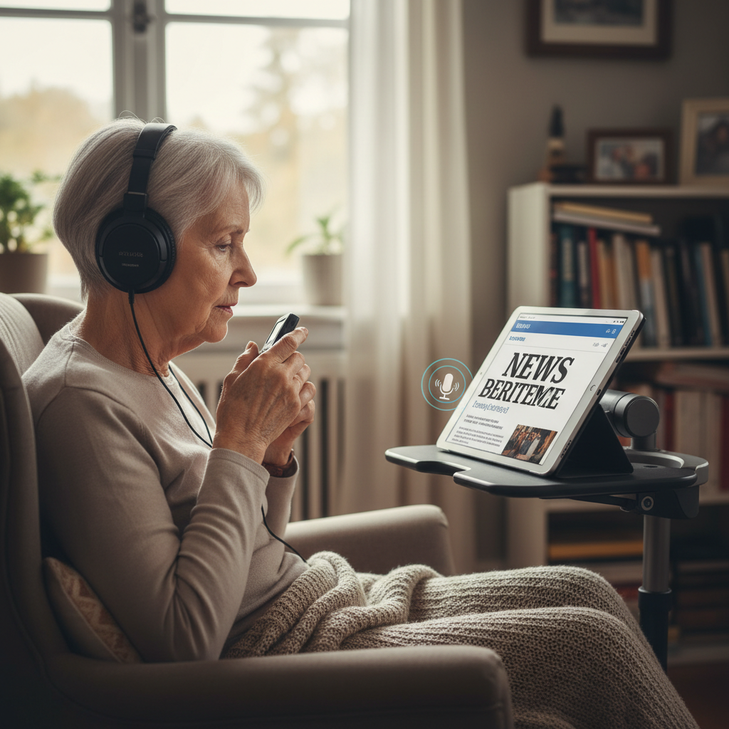Eine Seniorin nutzt eine Lernplattform mit anpassbarer Schrift und Sprachsteuerung – das Paradebeispiel für digitale Barrierefreiheit.