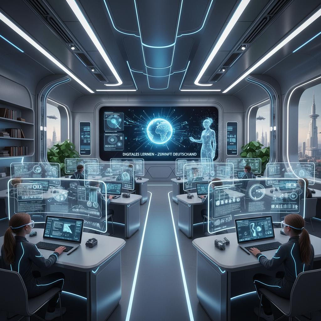 Ein futuristisches Klassenzimmer mit digitalen Lernplattformen für Deutsch.